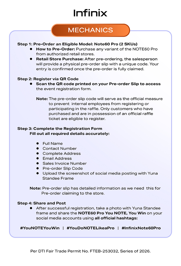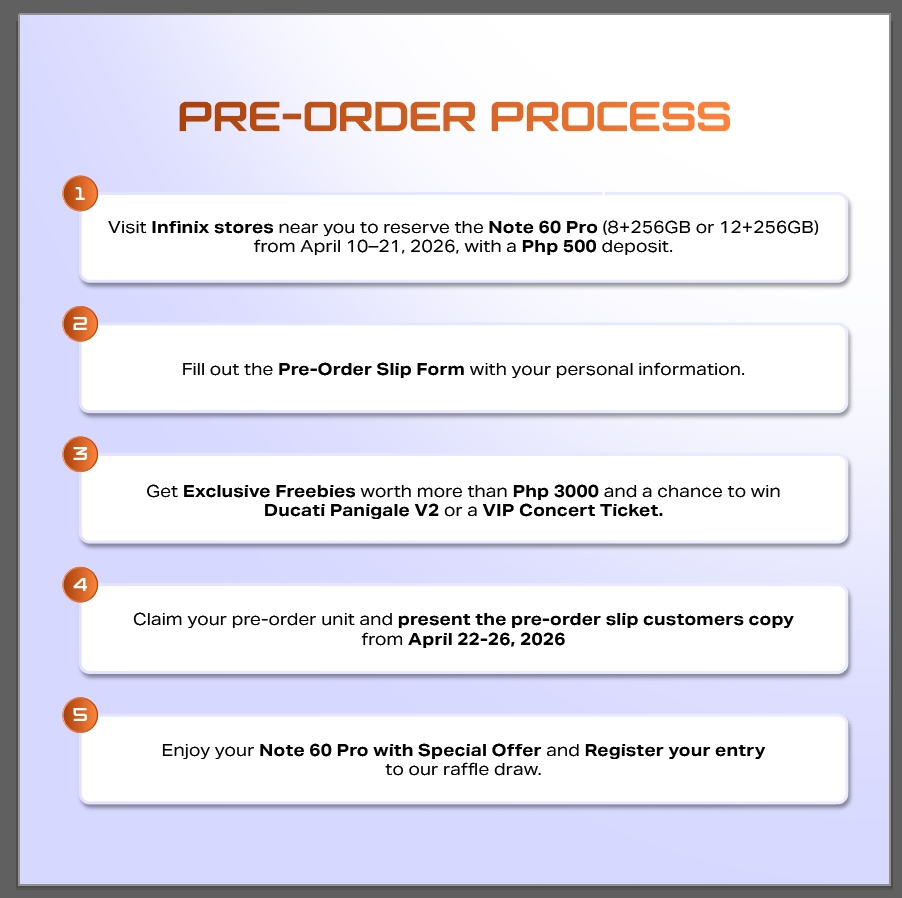 · How to Pre-Order: Purchase any variant of the Infinix NOTE60 Pro from authorized retail stores.